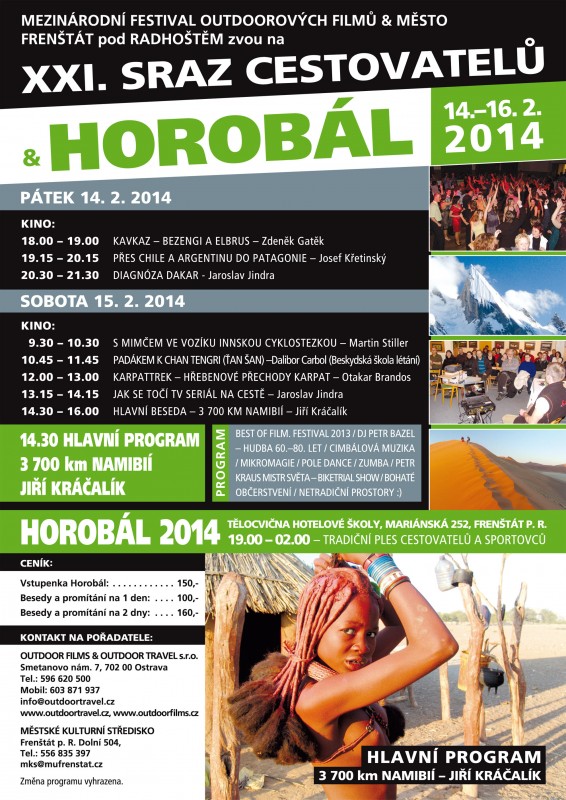 Mezinárodní festival outdoorových filmů a Město Frenštát pod Radhoštěm Vás srdečně zvou na XXI. SRAZ CESTOVATELŮ A HOROBÁL 2014, který se koná 14. - 16. 2. 2014 v kině a tělocvičně hotelové školy ve Frenštátě p. R.